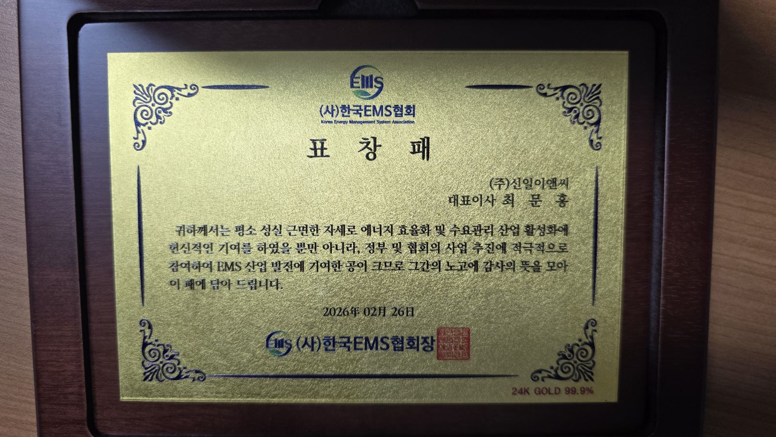 2026년 02월 26일 서울 EL타워 엘하우스 홀에서 개최된 (사)한국EMS협회의 2025년도 제14회 정기총회에서 (주)신일이앤씨 최문홍 대표이사가 EMS 산업발전에 기여하였으므로 표창패를 수상하였습니다.