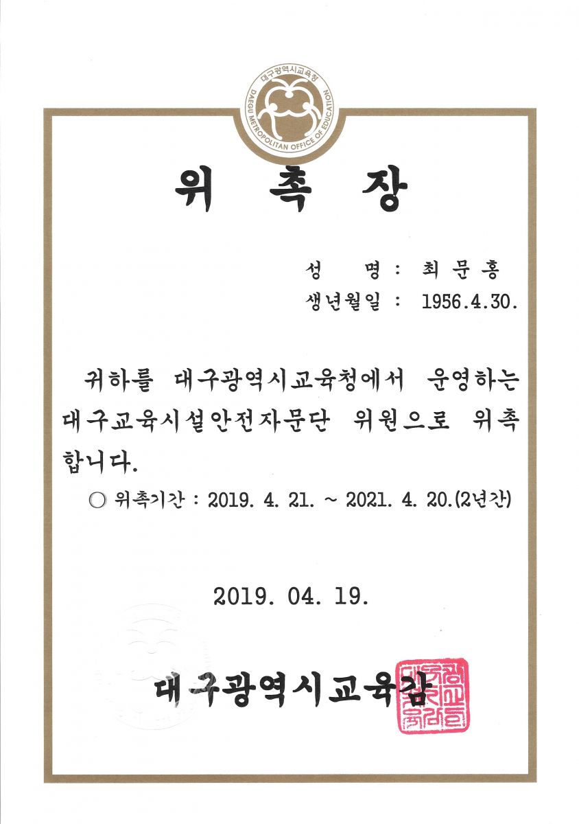 대구교육시설안전자문단 위원 위촉장(2019.04.19)